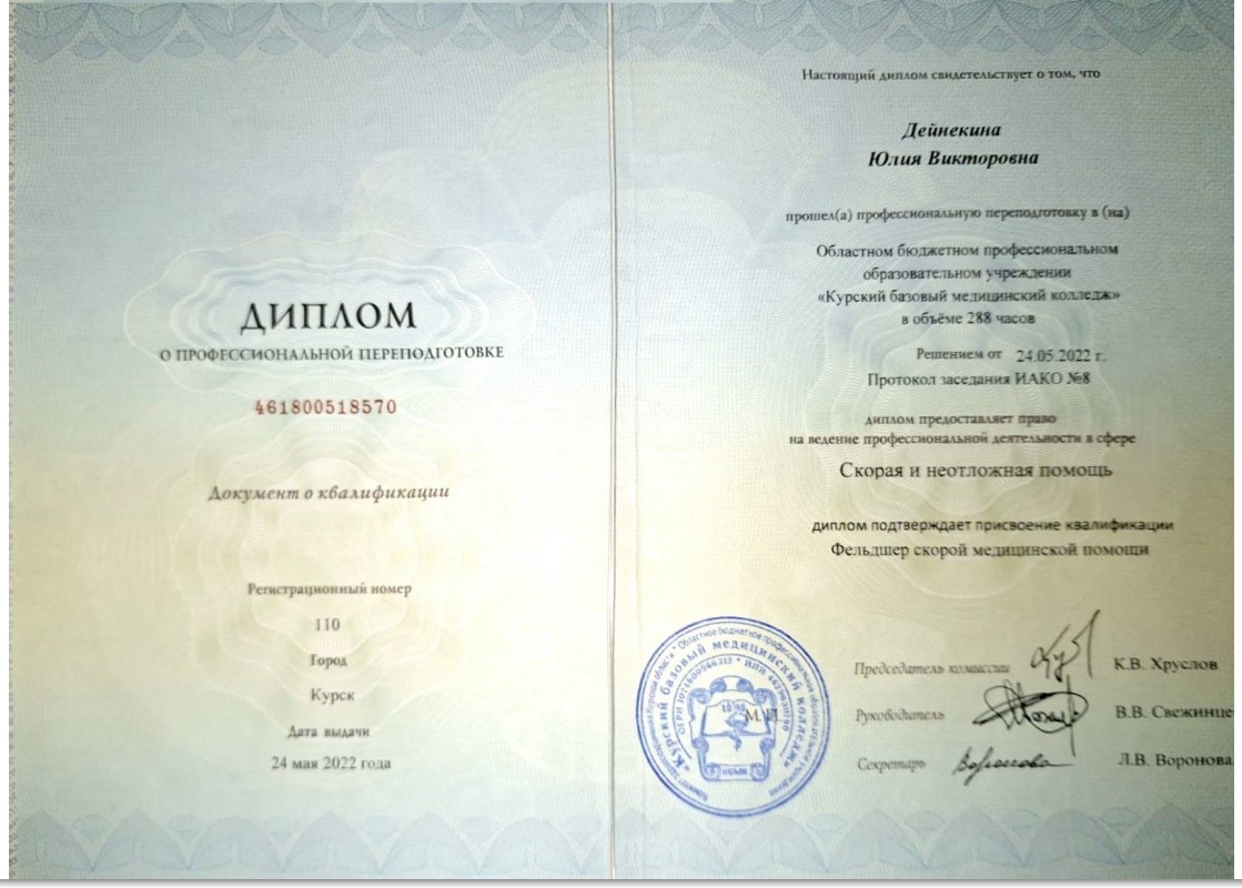 Фельдшер скорой медицинской помощи. Специалист с актуальной профессиональной подготовкой и профильной переподготовкой.